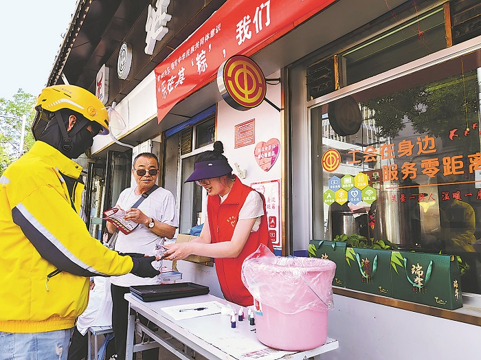 兴庆区总工会在“微驿站”向新就业形态群体赠送端午香粽。