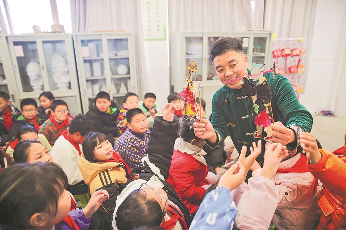 12月25日,在江苏省如皋市东陈镇南凌小学,非遗传承人指导学生皮影戏表演技巧。 南凌小学举办“非遗皮影迎元旦”主题活动,学生们通过观看皮影戏表演、亲手操作道具,深入了解非遗文化,感受传统艺术魅力。活动旨在激发学生对传统文化的兴趣,增强文化传承意识,为元旦增添节日氛围。本报通讯员 徐慧 摄