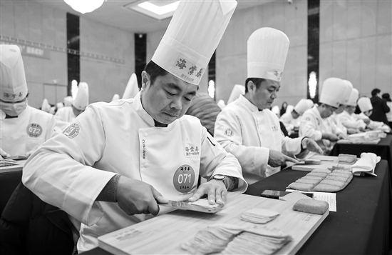 12月23日,泰州早茶“百人炫技千斤丝”非遗传承活动在江苏省泰州市海陵区泰州宾馆举行。百位干丝制作师傅同台献艺,展示泰州早茶中干丝的制作技艺。