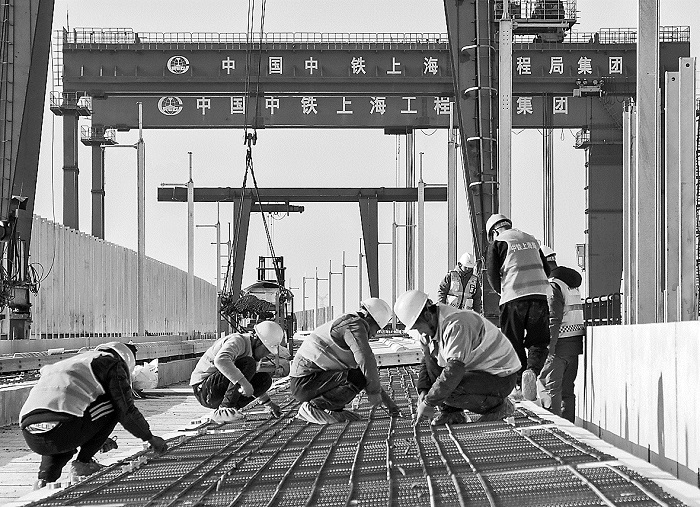 12月24日,在沪宁合高铁启东特大桥施工现场,工人正在紧张有序地进行无砟轨道施工。