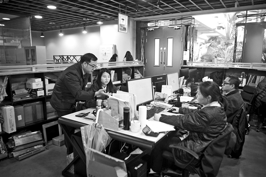 图为同事向唐和霞介绍与海外客户沟通的技巧。
