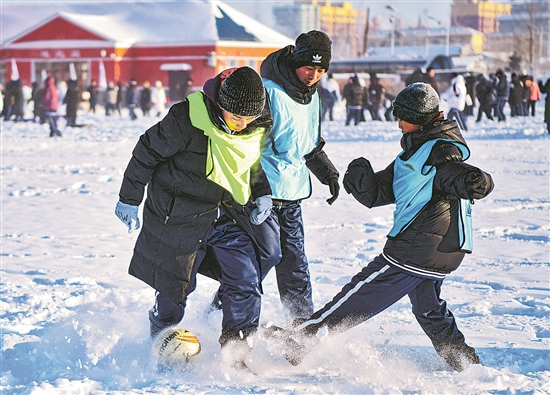 12月24日,内蒙古呼伦贝尔额尔古纳市第二中学学生参加雪地足球赛。