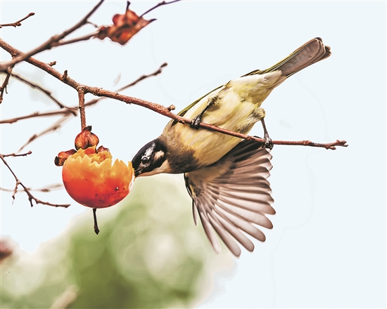 12月22日,江西南昌扬子洲,一只白头鹎正在吃柿子。随着扬子洲的柿子成熟,领雀嘴鹎、丝光椋鸟、黑领椋鸟、白头鹎、八哥等鸟儿都来抢食,常常为柿而战。陶长英 摄/视觉中国