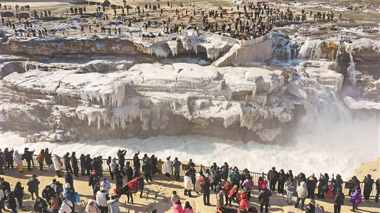 12月27日,游客在山西吉县黄河壶口瀑布景区游览观瀑(无人机照片)。