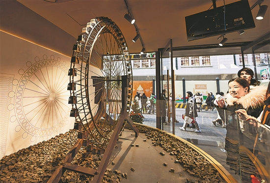 近日,位于天津市和平区金街步行街的天津巧克力博物馆正式开放。馆内陈列20余件巧克力雕塑作品,使用巧克力总量达10吨,由雕塑师纯手工打造。巧克力雕塑作品中既有“天津之眼”摩天轮、天津站等城市地标,又有哪吒闹海等故事场景,吸引众多游客参观打卡。新华社记者 赵子硕 摄