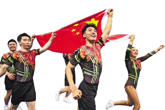 中国队在2025年成都世运会健美操五人操决赛夺冠后庆祝。新华社记者 杜子璇 摄