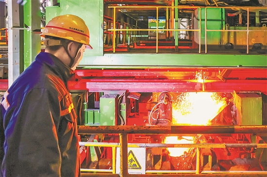 1月1日,马钢集团冶服公司职工在观察连铸机生产情况,以保证生产顺利进行。本报通讯员 陈亮 摄