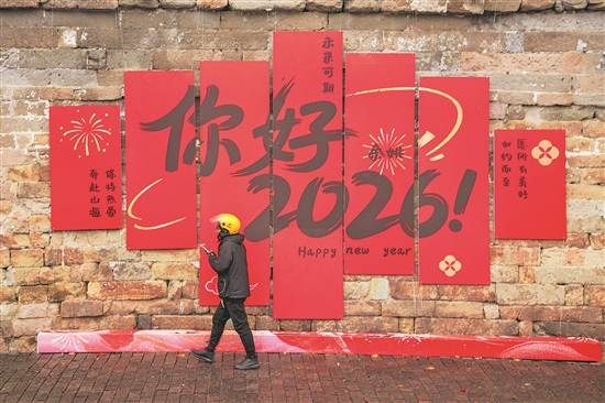 1月1日,浙江省余姚市城区阳明古镇,外卖小哥经过鼓楼2026年宣传墙。本报通讯员 张辉 摄