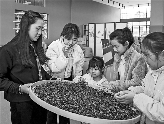 图为2025年12月21日,魏春(左一)在工作室给研学团队介绍茶叶制作流程。新华社记者 陈朔 摄