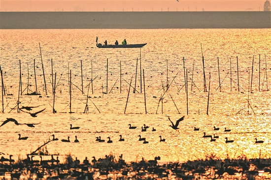 2025年12月25日,湖北黄冈,在龙感湖国家级自然保护区,工作人员乘巡护艇穿行于粼粼波光中,细致排查栖息地隐患、维护生态环境,确保候鸟安全越冬。作为长江中下游重要的候鸟越冬地,龙感湖近年通过生态修复与常态化巡护,为天鹅、鸿雁、东方白鹳等珍稀鸟类构筑起安全越冬屏障。王江 摄 / 视觉中国