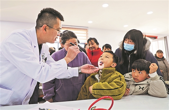 郑州大学第一附属医院医生在河南省武陟县乔庙镇为儿童进行诊疗。