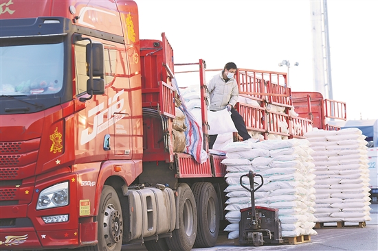 1月1日,北京新发地,面粉供货商在搬运货物。 本报记者 董鲁豫 摄