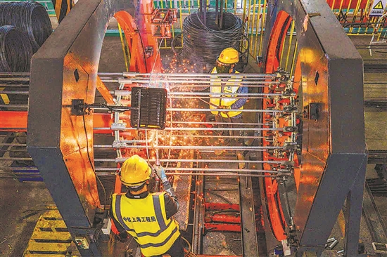 1月1日,工人在位于江苏省兴化市中铁上海工程局盐宜铁路项目部钢筋加工场进行焊接作业。本报通讯员 周社根 摄