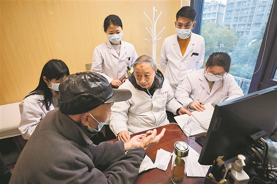 1月1日,江苏南京的一家中医馆内,80岁的江苏省名中医龙家俊教授(右三)正在看诊。本报记者 刘金梦 摄