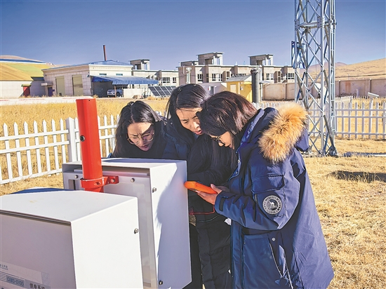 1月1日,唐古拉山南麓,海拔4800米的西藏那曲市安多气象站工作人员正在气象观测场检查气象设备,这是世界上海拔最高的有人值守气象站,被誉为“天下第一气象站”。本报通讯员 顿珠次仁 摄