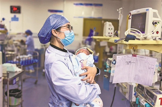 1月1日,贵州省铜仁市玉屏侗族自治县人民医院新生儿科医护人员在护理新生儿。 本报通讯员 胡攀学 摄
