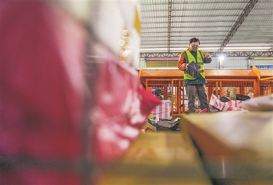 1月1日,工作人员在中国邮政集团有限公司湖南省永州市道县分公司邮件处理中心分拣快递包裹。本报通讯员 蒋克青 摄