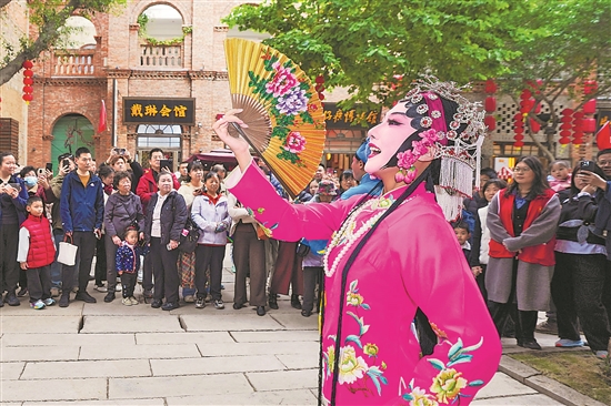 1月1日,在福建省福州市台江区的上下杭历史文化街区,非遗闽剧演员带来的快闪节目,吸引游客驻足欣赏。本报通讯员 谢贵明 摄