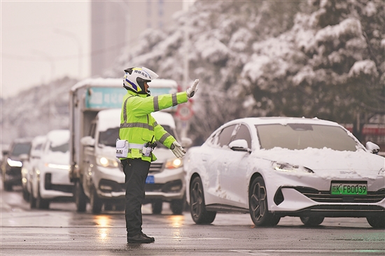 1月1日,安徽省阜阳市阜南县交警在城区主要路口维持交通秩序,保障节日期间道路畅通。本报通讯员 吕乃明 摄