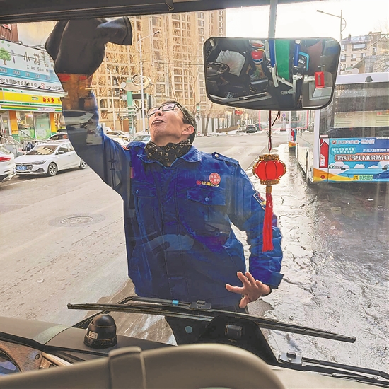 1月1日,沈阳地铁巴士有限公司207路公交车的一名员工正在擦拭车窗玻璃。本报通讯员 李海涛 摄