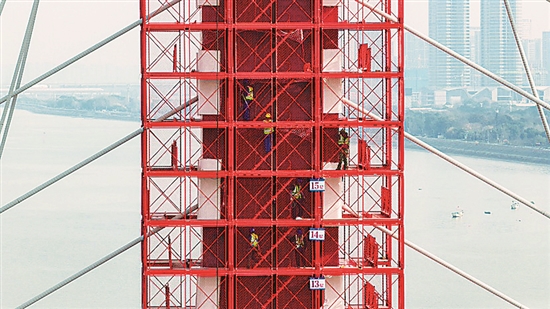 1月1日,浙江杭州钱江三桥改扩建的建设者们正在施工。本报通讯员 刘倩 摄