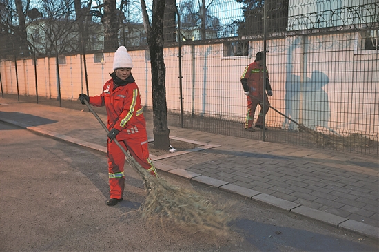 1月1日,清晨六点半,北京市朝阳区环卫工张建娜已经开始了街面清扫工作。本报记者 王羡茹 摄