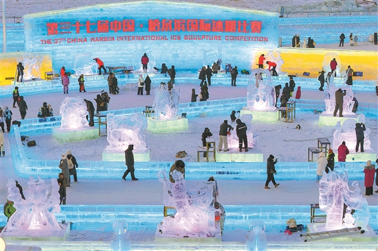 1月3日,参赛选手在哈尔滨冰雪大世界园区内进行冰雕创作。当日,在哈尔滨冰雪大世界进行的第37届中国·哈尔滨国际冰雕比赛进入第2天赛程,来自12个国家的76位选手在严寒中精雕细琢,参赛作品已芳容初现。新华社记者 张涛 摄