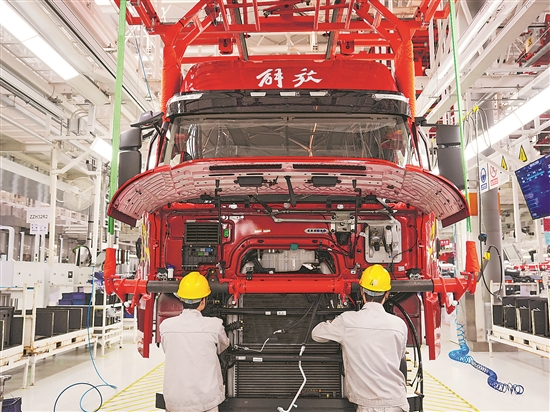 1月4日,工人在一汽解放J7整车智能工厂装配车辆。