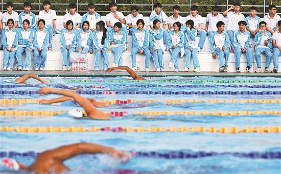 当日,海南中学白沙学校学生在观摩国家游泳队训练。新华社记者 杨冠宇 摄