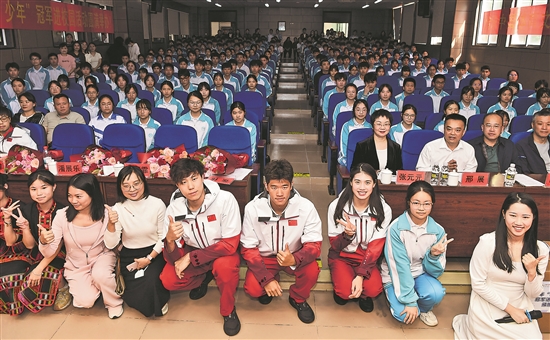当日,张雨霏(前排右二)、潘展乐(前排右三)、覃海洋(前排右四)在活动结束后与现场师生合影留念。新华社记者 杨冠宇 摄