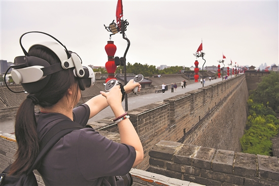 游客在西安城墙一处马面上体验一款以射箭守城为主题的MR混合现实游戏。