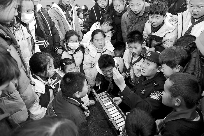1月6日,江苏省宿迁市公安局宿豫分局曹集派出所民警向学生宣传禁毒知识。民警通过展示仿真毒品模型、面对面交流等方式,向学生宣传禁毒法律法规知识,讲解毒品的危害和识别方法,提高学生的防毒拒毒意识和识毒能力,为青少年健康成长营造安全环境。本报通讯员 王力 摄