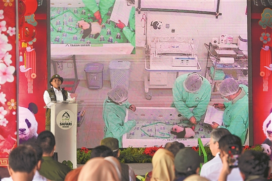 图为当地时间1月6日,在印度尼西亚西爪哇省茂物县的野生动物园,印尼林业部长拉贾·朱利·安东尼向观众介绍大熊猫幼仔“里奥”。
