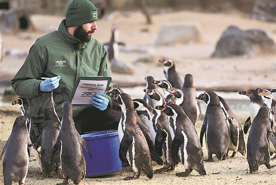 近日,英国伦敦动物园对园内饲养的动物进行一年一度的大盘点。图为近日,在英国伦敦动物园,一名工作人员对企鹅进行盘点。