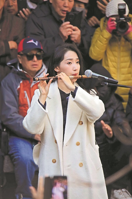 周六清晨的北京紫竹院公园,寒风裹着松枝的清香掠过湖面,退休工人老张裹紧棉衣沿湖散步时,一阵清亮的笛声突然穿透晨雾。循声穿过打太极的人群,他看见小广场中央,一位身着米白色羽绒服的女青年正手持竹笛演奏,周围里三层外三层地挤满了观众——她正是中国歌剧舞剧院青年竹笛、排箫演奏家孙楚泊。
