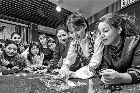 1月6日,新疆乌鲁木齐市沙依巴克区友好南路街道金色花苑社区辖区新疆比比拉服装设计公司,学员们正在进行服装裁剪练习。