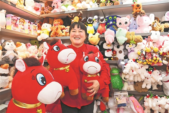 1月12日,在浙江义乌市国际商贸城一区玩具销售区,市场经营户展示销售的“哭哭马”小马公仔玩具。