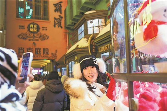 1月11日,游客在哈尔滨中央大街的肖克庭院游玩拍照。