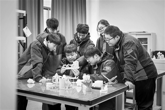 1月11日,安徽马鞍山,马鞍山市职业技术学院增材制造专业学生正在研讨3D打印模型。