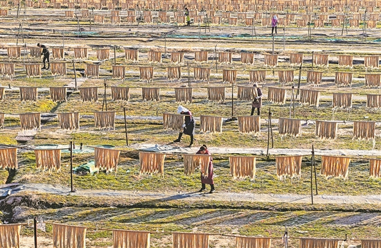 1月12日,浙江省台州市仙居县大战乡车头村,村民忙着晾晒红薯粉条,一排排粉条挂满晾架,在冬日暖阳下呈现出一幅丰收画卷。