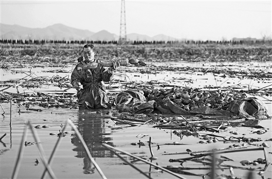 1月11日,安徽省宿松县省属农垦华阳河农场莲藕种植基地,藕农在采收莲藕。
