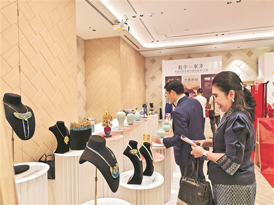近日,“无界创想,青春链接”中泰青年文化交流系列活动在泰国曼谷举行。图为一名观众在中泰青年文化交流系列活动开幕式现场浏览中国工艺品。 视觉中国 李映民 摄