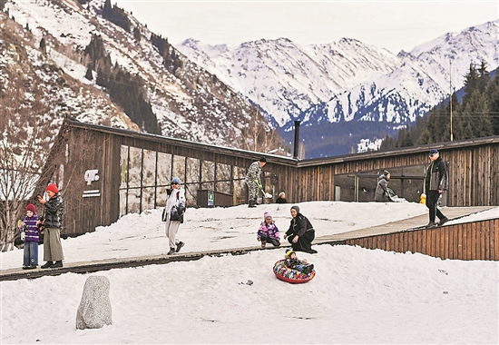 近日,哈萨克斯坦阿拉木图市郊山区被冰雪覆盖,人们纷纷到户外享受冬日雪趣。图为近日,人们在白雪覆盖的山地游玩。新华社记者 李任滋 摄