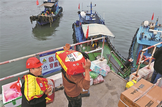 1月15日,海上作业平台工人食堂的师傅们搬运新采购的食材。