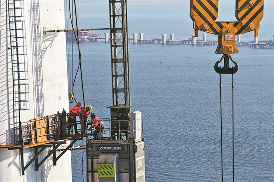 15日清晨5时,潮声还未醒透,来自重庆的李建国已经穿好工装,走向刘五店航道桥东主塔。作为塔吊司机,他要爬上离地180多米的高空,在只有两三平方米的操作室里开始一天的工作。