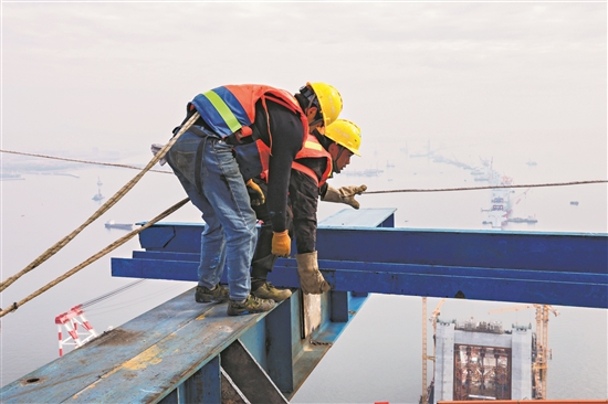 同样在晨光中忙碌的,还有来自四川乐山的焊工代成友。他弓着身子,在火花四溅的焊花里一干就是几个小时。参与厦金大桥建设之前,他还参与过贵州鸭池河大桥、重庆嘉陵江大桥等10多座桥梁建设。“我们是建设者,哪里需要就往哪里走。”他说。