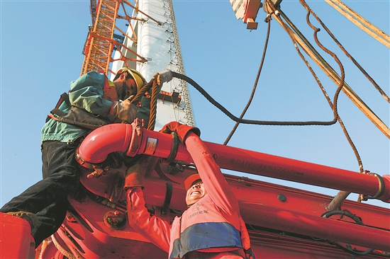 1月14日,两名工人合力将塔吊钢索挂绳穿过待转运的混凝土泵车车身。