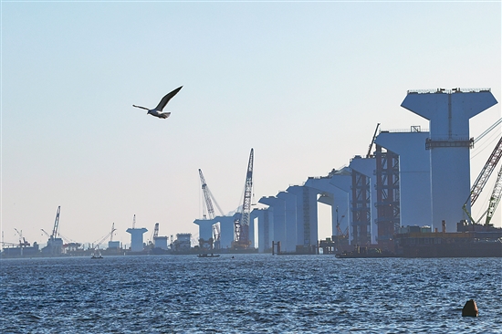 1月16日,正在施工中的厦金大桥西主塔,一群海鸟从塔顶飞过。