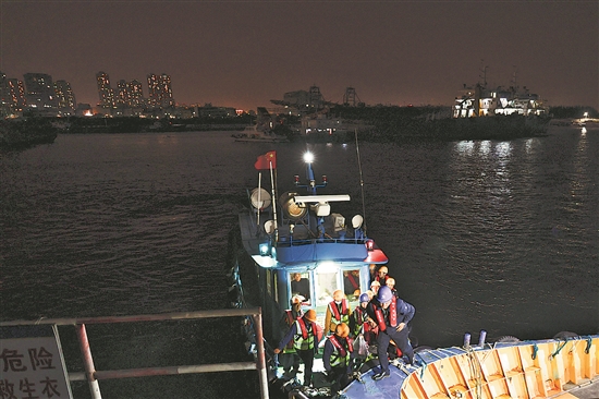 1月13日晚,工人们乘坐交通船回到岸边。海上作业平台离岸约3公里,乘船要20分钟。