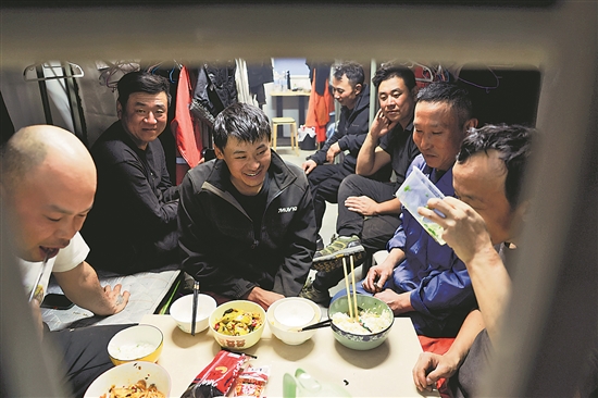 1月14日晚,在海上作业平台一间职工宿舍,几名相熟的工友聚在一起吃饭、聊天。